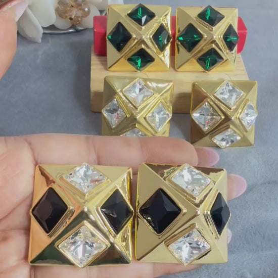 Crafted in a premium anti-tarnish gold finish, these striking square studs feature deep emerald green crystal stones set in a modern geometric pattern, creating a luxurious, high-fashion look.